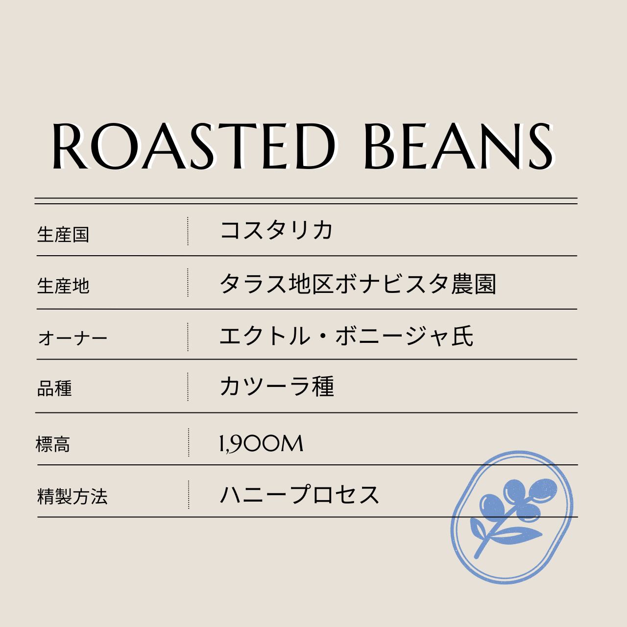 ボナビスタ農園は、コスタリカのタラス地区に位置する美しい山々に囲まれた環境の農園です。標高1950mの農園は「雲の上」に位置します。標高が高いことでコーヒーの実はゆっくりと時間をかけて完熟していき、その間に生まれる糖分や風味特性の元がコーヒーの甘さと香りを生み出します。